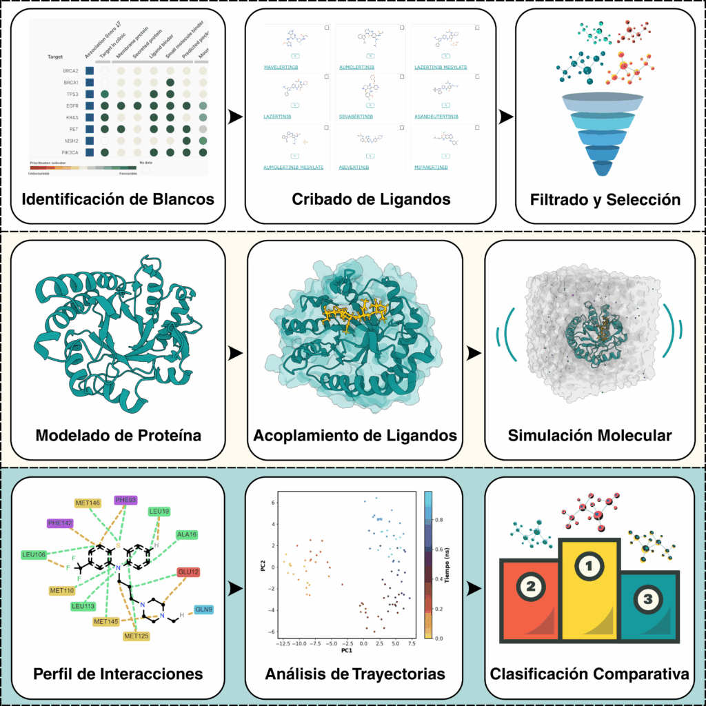 El enfoque es completamente práctico, con cuadernos interactivos y código inicialmente oculto que los estudiantes podrán revisar y modificar si lo desean. Además, los equipos desarrollarán un mini-proyecto en el cual seleccionarán una proteína pequeña y un fármaco conocido para aplicar lo aprendido. El objetivo es que los estudiantes adquieran habilidades reproducibles que puedan extender a futuros proyectos de investigación en biotecnología y biofarmacia.